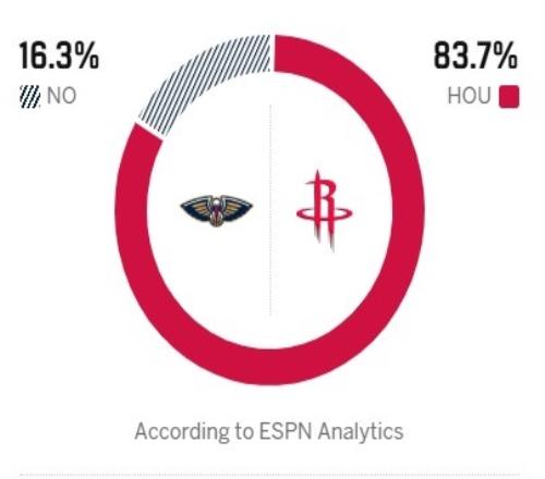 ESPN预测本场胜率:火箭83.7%,鹈鹕16.3%。