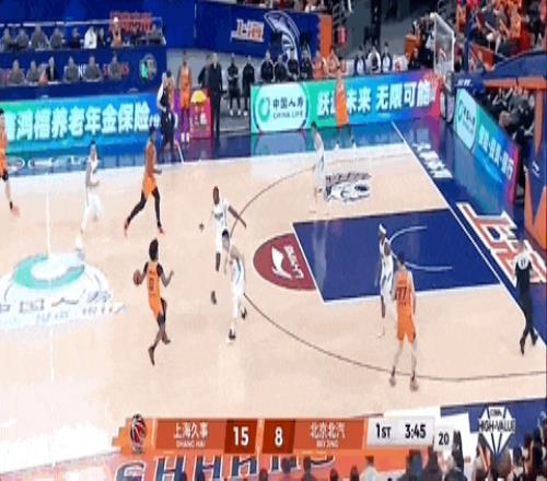 杰曼面对刘礼嘉,从左路突进,将球塞给塔瑞克,后者跃起擦板得分。古德温带球,分刘礼嘉后回传到自己手上,正面拔起三分不进。杰曼拿到篮板,一条龙直冲篮下,拉杆再进!北京队将比分逼近到30-34,上海队叫停比赛。